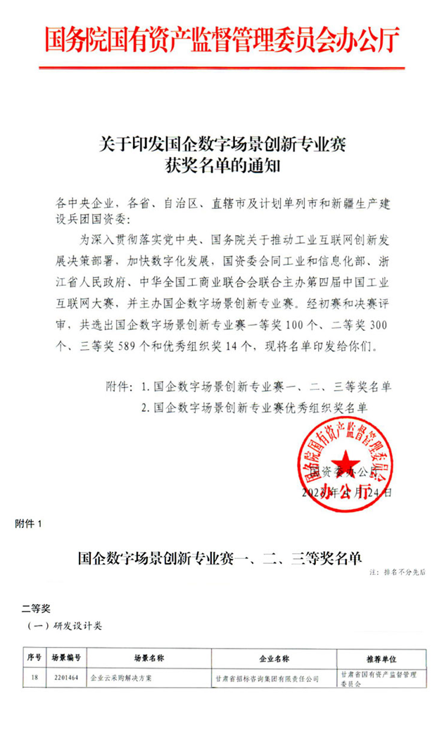 近日,国务院国资委公布了首届“国企数字场景创新专业赛”获奖名单。乐动·官方端网站在线组织推荐的“甘招企业云采购平台”创新场景,在全国2007家参赛企业推荐的3277个场景中脱颖而出,荣获二等奖!