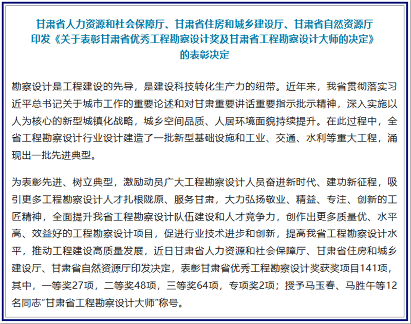 5月中旬,省人力资源和社会保障厅、省住房和城乡建设厅、省自然资源厅印发《关于表彰甘肃省优秀工程勘察设计奖及甘肃省工程勘察设计大师的决定》,乐动·官方端网站在线38项勘察设计项目(作品)获“甘肃省优秀工程勘察设计奖”,其中一等奖9项,二等奖16项,三等奖13项;毛明强、李中辉、张岭峻获“甘肃省工程勘察设计大师”称号。