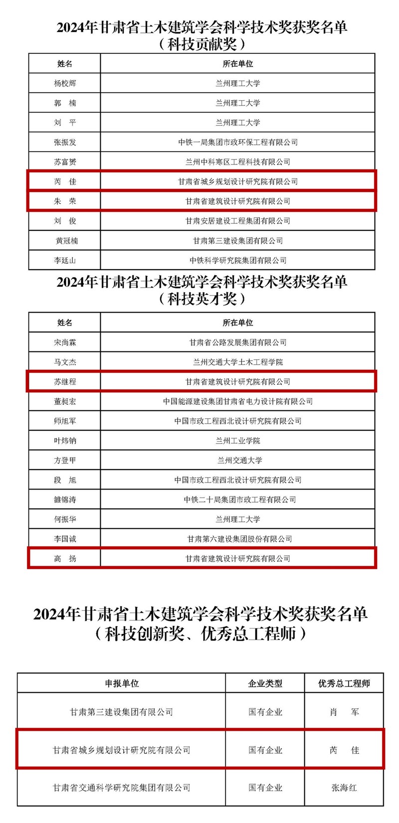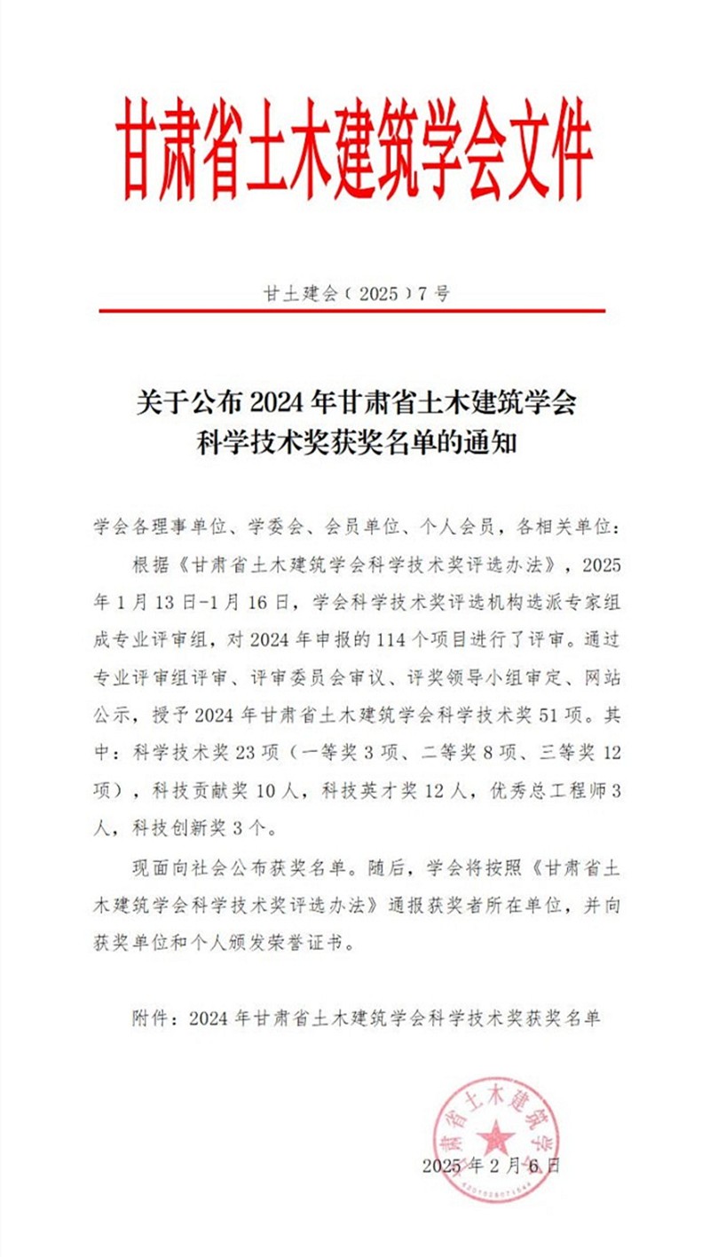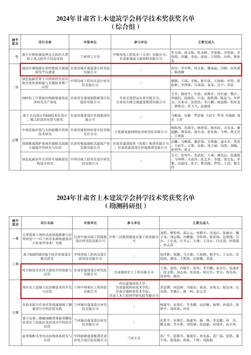 近日,2024年甘肃省土木建筑学会科学技术奖获奖结果公布,乐动·官方端网站在线斩获多项荣誉。其中,省建筑设计院申报的《咬合桩技术在深大基坑中的创新与应用》项目荣获“科学技术奖(勘测科研组)二等奖”,省城乡规划院申报的《城市区域地震灾害模拟及规划研发平台建设》项目荣获“科学技术奖(综合组)二等奖”,土木工程院参与的《寒区水工混凝土抗冲磨技术的开发与应用》项目荣获“科学技术奖(勘测科研组)三等奖”。省建筑设计院、省城乡规划院4人分别荣获“科技贡献奖”“科技英才奖”“科技贡献奖”“优秀总工程师奖”等荣誉称号。