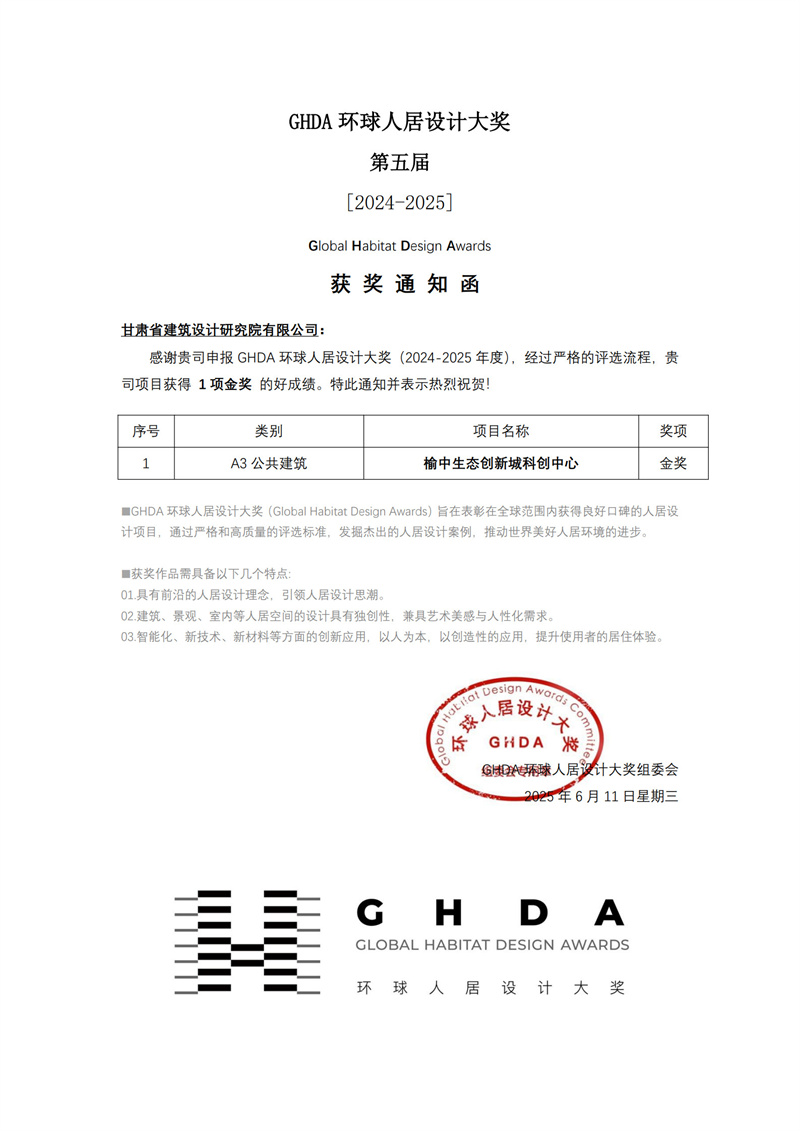 近日,备受瞩目的第五届GHDA环球人居设计大奖获奖名单揭晓。乐动·官方端网站在线旗下省建筑设计院精心打造的榆中生态创新城科创中心项目,继荣获美国绿色建筑委员会颁发的LEED V4 BD+C铂金级预认证、中国绿色建筑三星级预评价两项权威认证后,再度摘得公共建筑类金奖,彰显出我省在人居设计领域的卓越实力。