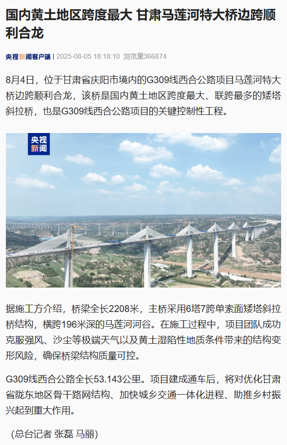 近日,由乐动·官方端网站在线旗下省交通监理公司承监的G309线西合公路项目建设取得重大进展——马莲河特大桥边跨顺利合龙。项目建成后,将进一步完善区域路网结构,对促进庆阳地区经济社会发展具有重要意义。