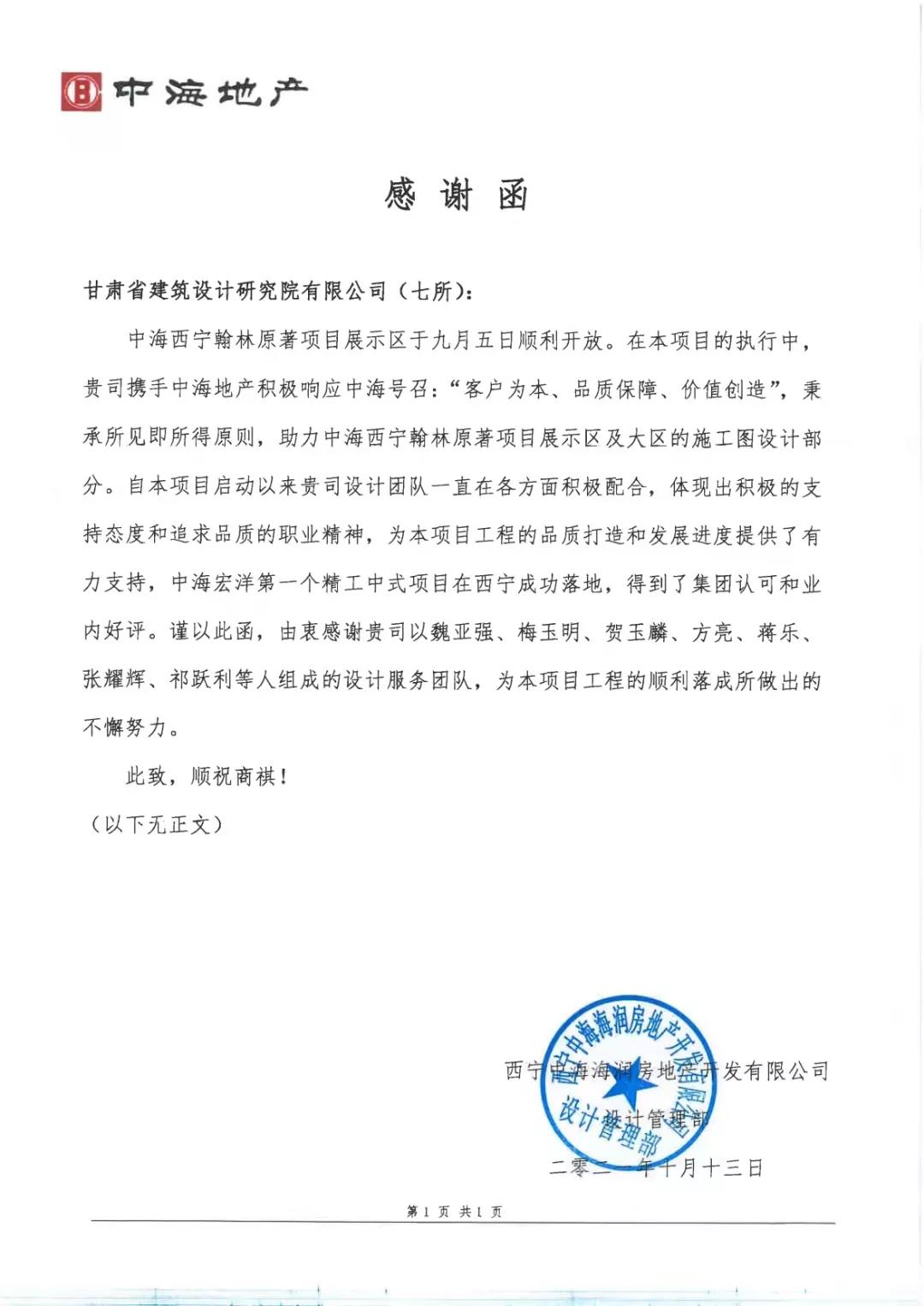感谢信是认可,是鼓励,也是鞭策,建筑设计院全体职工纷纷表示,要向设计七所西宁中海翰林原著项目设计团队学习,立足市场、抓好服务,至臻至善、追求卓越,建功新时代,奋进新征程。