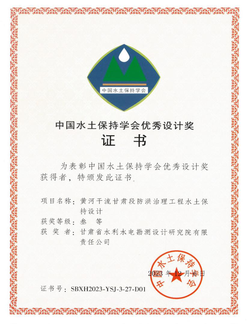 近日,第四届中国水土保持学术大会在福建福州举行。省水电设计院勘测设计的《武威市民勤县红崖山水库加高扩建工程水土保持设计》《黄河干流甘肃段防洪治理工程水土保持设计》两项水土保持设计成果荣获第四届中国水土保持学会优秀设计三等奖。