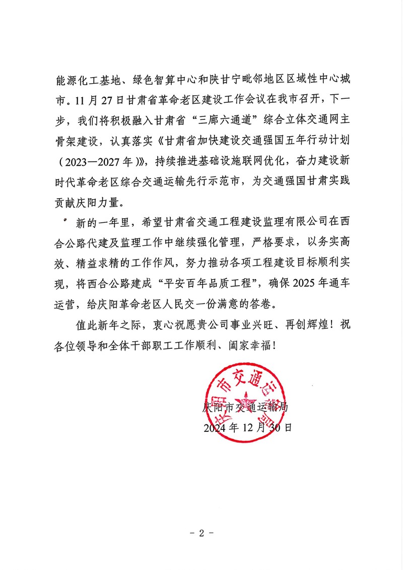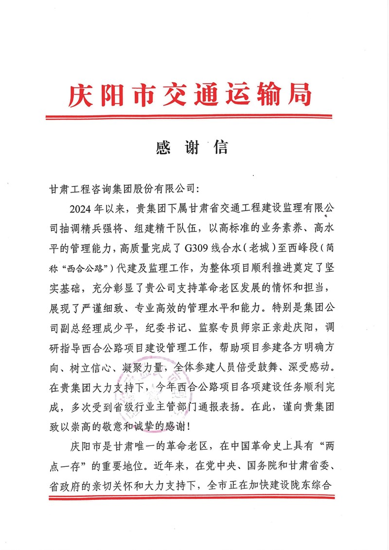 12月30日,乐动·官方端网站在线收到庆阳市交通运输局的感谢信,向省交通监理公司在G309线合水(老城)至西峰段公路项目建设过程中作出的贡献表示感谢。