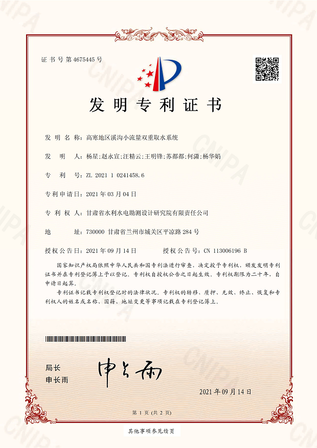 发明专利证书—高寒地区溪沟小流量双重取水系统