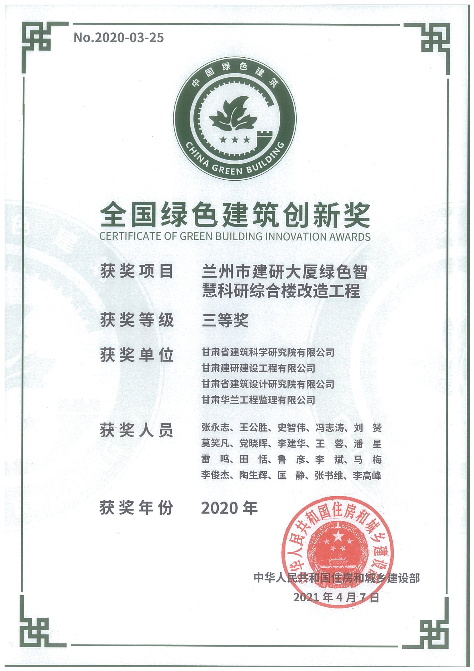 全国绿色建筑创新奖(兰州市建研大厦绿色智慧科研综合楼改造工程)